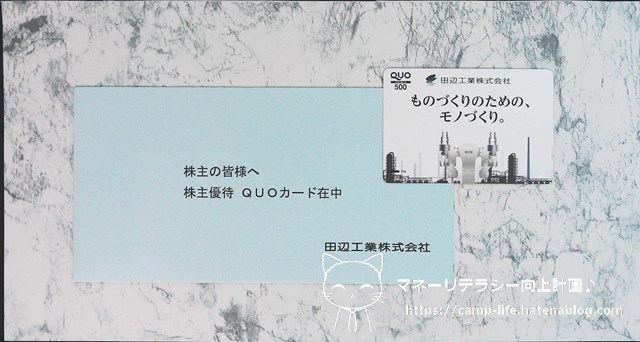 田辺工業の株主優待は単元株以上の株主に一律500円相当のクオカードです。